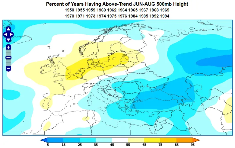 The positive EA-WR usually brings a dry summer to much of Central and Northern Europe. Parts of Southern Europe can be wetter than normal, particularly over Southern Iberia (Figure 8).